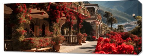 Obraz z serii pejzaże zatytułowany Czerwona Idylla, przedstawia romantyczną scenę otuloną w bujne, kwitnące bougainvillea, które zdobią klasyczną architekturę z widokiem na malownicze wzgórza. Czerwone kwiaty przypominające klejnoty, kontrastujące z ciepłą paletą pastelowych ścian i żywej zieleni, przywołują uczucie wiecznego lata. To arcydzieło znakomicie komponowałoby się w przestronnych, jasnych przestrzeniach, takich jak rezydencje w stylu śródziemnomorskim, ekskluzywne spa czy jako element wyróżniający w eleganckich restauracjach, zapraszając do marzeń o długich, leniwych dniach nad Morzem Śródziemnym.
