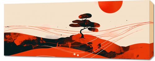 Obraz z serii minimalistyczne zatytułowany Czerwone Pustynne Pejzaże. Praca artystyczna przedstawia stonowany, lecz intensywny krajobraz z dominującymi czerwieniami i pomarańczami, z sylwetką charakterystycznego drzewa na pierwszym planie, co może sugerować inspiracje krajobrazami Afryki lub Australii. Ten obraz to świetny wybór dla wnętrz inspirowanych przyrodą i podróżami, przynoszących element globalnej wędrowki do domowego zacisza. Może dodać dramatyzmu i życia dużym, otwartym przestrzeniom, takim jak salon czy hol.