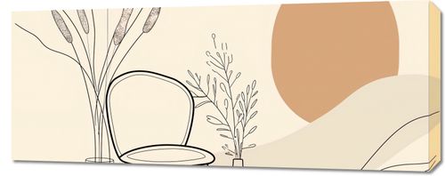 Obraz z serii boho zatytułowany Kącik Spokoju. Obraz prezentuje delikatny, linearny rysunek wnętrza, gdzie w centrum znajduje się eleganckie krzesło umieszczone obok stolika z wazonem i wysokimi, smukłymi roślinami. W tle, duża, okrągła forma w ciepłym, terra-cotta kolorze nadaje całości miękkiego, przytulnego charakteru. Linearna, subtelna paleta barw oraz gra cieni i światła tworzy atmosferę relaksu i wyciszenia. Ten obraz będzie doskonałym wyborem do dekoracji wnętrza, które ma być przestrzenią do odpoczynku i regeneracji. Jego prostota i elegancja sprawią, że doskonale odnajdzie się w salonach, pokojach do czytania, gabinetach czy medytacyjnych kącikach, wprowadzając spokojny i zbalansowany nastrój.