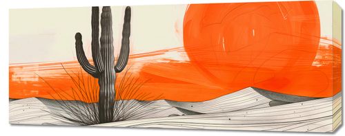 Obraz z serii abstrakcja zatytułowany Kaktus Saguaro przedstawia surrealistyczny krajobraz pustynny, w którym dominuje wielki kaktus saguaro w centrum kompozycji. Szczegóły rośliny są wyraźne i realistyczne, z kolcami i wydłużonymi ramionami, które sięgają ku niebu. Tło to abstrakcyjna interpretacja zachodu słońca, z dużym, intensywnie pomarańczowym słońcem, które zajmuje większą część górnej połowy plakatu. Niebo jest przejrzyste, z nielicznymi smugami, które dodają głębi i dynamizmu. Pustynna ziemia jest przedstawiona liniami, które falują i kręcą, tworząc wzór przypominający piasek modelowany przez wiatr. Paleta barw skupia się na odcieniach pomarańczowego, beżowego i czerni, co nadaje kompozycji ciepły i spokojny nastrój. Obraz ma wyraźnie współczesny charakter, łącząc elementy realistyczne i abstrakcyjne, co czyni go atrakcyjnym dla szerokiej gamy gustów artystycznych.