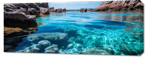 Obraz z serii pejzaże zatytułowany Krystaliczna Woda uchwytuje hipnotyzującą przejrzystość turkusowych wód u wybrzeży skalistej zatoki. Jasne, żywe kolory wody kontrastują z surowymi, ciemnymi odcieniami skał, tworząc obraz, który jest zarówno surowy, jak i oczyszczający. Gra światła pod wodą rysuje zawiłe wzory na kamieniach, przypominając o nieskończonej różnorodności i pięknie naturalnego świata. Ten pejzaż morski doskonale wkomponuje się w przestrzenie pełne naturalnego światła i przestronności, takie jak spa, luksusowe łazienki, czy jasne recepcje hotelowe, gdzie może przynieść odrobinę spokoju i poczucia połączenia z naturą.