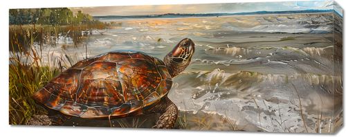 Plakat z serii abstrakcja zatytułowany Nadmorski Żółw. Przedstawia realistycznie namalowanego żółwia na tle malowniczego krajobrazu nadmorskiego. Żółw o imponującej, bogato zdobionej skorupie o ciepłych, miedzianych i brązowych odcieniach, stoi na złocistym piasku u brzegu wody. Wokół niego delikatne trawy i roślinność nadmorska, które wraz z żółwiem są oświetlone jasnym, ciepłym światłem, sugerującym zachód słońca. Tło obrazu to dynamicznie przedstawione, szarawe fale morskie, które łagodnie uderzają o brzeg, oraz zachmurzone niebo z prześwitami niebieskiego i złotymi refleksami słońca. Scena wywołuje poczucie spokoju i harmonii z naturą, podkreślając piękno i siłę powolnego, ale pewnego postępu, symbolizowanego przez żółwia. Świetnie sprawdzi się we wnętrzach o tematyce morskiej, jak i również restauracjach.