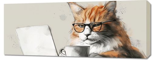 Obraz z serii abstrakcja zatytułowany Nie przed Kawusią. Przedstawia uroczy obraz kota o rudym umaszczeniu, który nosi okulary i wydaje się być zaczytany w ekranie laptopa. Scena jest przedstawiona w ciepłych, nasyconych barwach, które podkreślają miękkość i puszystość futra kota. Elementy graficzne, takie jak plamy i rozpryski farby, nadają kompozycji artystycznego charakteru. Filiżanka kawy umieszczona obok laptopa dodaje codziennej atmosfery, sugerując, że może to być obrazek z domowego biura lub miejsca relaksu. Ten obraz mógłby być idealnym elementem dekoracyjnym dla miłośników kotów i tych, którzy cenią sobie humor oraz lekkość w aranżacji swojego wnętrza, zarówno w domowym biurze, jak i w przestrzeni wypoczynkowej.
