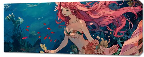Obraz z serii wnętrza zatytułowany Nimfa Oceanu przedstawia eteryczną postać kobiecą zatopioną w głębinach morskich. Jej długie, różowe włosy płyną z prądem wody, mieszając się z otaczającymi ją kwiatami i roślinami morskimi. Czerwone ryby dodają akcentu kolorystycznego, tworząc wrażenie ruchu i życia pod wodą. Postać nimfy, z jej delikatną sylwetką i spokojnym wyrazem twarzy, stanowi centralny punkt kompozycji, sugerując spójność człowieka z naturą. Ten oniryczny obraz świetnie sprawdzi się jako element dekoracyjny w przestrzeniach relaksacyjnych takich jak spa, salony piękności, a także jako inspirująca dekoracja do pokoju osobistego lub medytacyjnego, zachęcając do refleksji i wyciszenia.