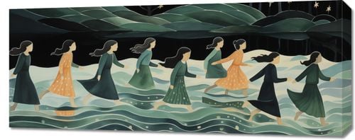 Obraz z serii wnętrza zatytułowany Nocna Procesja, przedstawia sylwetki kobiet, idących w rytmicznym ruchu przez wody, pod tajemniczym, gwiaździstym niebem. Styl obrazu, z płynnymi liniami i miękkimi pastelowymi kolorami, tworzy uczucie spokoju i onirycznej atmosfery. Postacie są przedstawione w ruchu, z włosami rozwianymi przez nocny wiatr, co dodaje dziełu poczucia tajemnicy i ruchu. Ten obraz idealnie nadaje się do wnętrz, które chcą wyrazić poczucie spokoju, introspekcji oraz kobiecej siły i solidarności, takich jak prywatne biblioteki, pokoje medytacyjne, a także przestrzenie publiczne, które pragną inspirować swoich gości do głębszego zastanowienia się nad otaczającym ich światem.