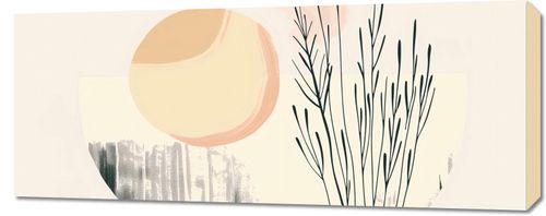 Obraz z serii boho zatytułowany Pastelowy Wschód. Obraz ukazuje subtelny, linearny rysunek roślinności na tle dużego, pastelowego słońca i delikatnie zaznaczonych elementów krajobrazu. Kompozycja w pastelowych, ciepłych barwach tworzy wrażenie spokojnego wschodu słońca, który rozświetla delikatne kontury roślin i miękkie formy w tle. Obraz ten idealnie wpasuje się do wnętrz o stonowanej kolorystyce, gdzie może dodać odrobinę ciepła i subtelnego charakteru. Doskonale nadaje się do sypialni, salonów, czy innych miejsc odpoczynku, gdzie wprowadzi łagodny nastrój i poczucie wyciszenia.