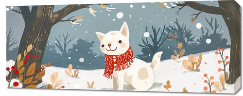 Obraz z serii wnętrza zatytułowany Śnieżny Kompan. Urocze przedstawienie białego, puchatego psa w czerwonym szaliku, który przywołuje ciepłe uczucia w chłodnym, zimowym otoczeniu. Zwierzę z radosnym wyrazem twarzy wydaje się cieszyć spadającymi płatkami śniegu, co dodaje obrazowi poczucia radości i bezpretensjonalnej zabawy. Tło w pastelowych odcieniach bieli i szarości z delikatnymi akcentami kolorystycznymi tworzy spokojną i relaksującą atmosferę. Obraz idealnie nadaje się do dekoracji pomieszczeń dziecięcych, salonów, czy przytulnych kawiarni, wprowadzając do wnętrza element zabawy i niewinności. Jego ciepłe barwy i sympatyczny motyw sprawią, że będzie doskonałym dodatkiem do miejsc, w których chcemy poczuć odrobinę zimowego ciepła i uroku.