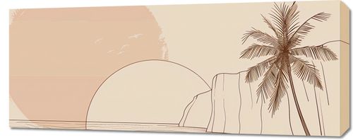 Obraz z serii minimalistyczne zatytułowany Szept Tropików. Plakat przedstawia delikatnie zarysowany krajobraz tropikalny o wschodzie lub zachodzie słońca. W centralnej części kompozycji widnieje wielki, ciepły dysk słońca, którego połowa chowa się za horyzontem. U jego podstawy majaczą delikatne linie morza, a na pierwszym planie z prawej strony wznosi się smukła palma o finezyjnie narysowanych liściach. Z lewej strony rysunek przedstawia wysokie klify, które wyłaniają się z morza, a na tle słońca można dostrzec lekkie sylwetki ptaków. Ten plakat to kwintesencja spokoju i harmonii, świetnie sprawdzi się w pomieszczeniach, które mają być oazą relaksu, takich jak salon, sypialnia czy pokój do medytacji. Jego ciepłe, pastelowe barwy i proste linie mogą również dodać elegancji i spokoju do przestrzeni biurowych, wspomagając skupienie i kreatywne myślenie.