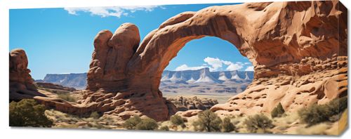 Obraz z serii pejzaże zatytułowany Triumf Natury. Zapierający dech w piersiach widok naturalnej formacji skalnej, która tworzy naturalny łuk, jest świadectwem niezwykłej siły i wytrwałości natury. Ciepłe odcienie pomarańczu i brązu skalnego łuku kontrastują z głębokim błękitem nieba, a delikatne zielone akcenty roślinności dodają życia i głębi kompozycji. Ta scena emanuje siłą i spokojem, stanowiąc doskonałe uzupełnienie dla przestrzeni takich jak współczesne biura, eleganckie pokoje dziennego wypoczynku, a także jako element dekoracyjny w hotelach i miejscach publicznych, gdzie natura spotyka się z designem.