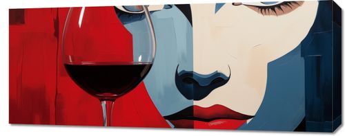 Obraz z serii wnętrza zatytułowany Żywa Czujność to dzieło, które przyciąga uwagę dynamicznym kontrastem i silnym wyrazem. Ta pełna wyrazu kompozycja łączy w sobie żywe czerwienie i chłodne błękity, tworząc tło dla zarysowanej sylwetki kobiety, której przyciągający wzrok, zdecydowany makijaż akcentuje jej głębokie spojrzenie. Kieliszek czerwonego wina na pierwszym planie nie tylko dodaje głębi obrazowi, ale także symbolizuje głębię i bogactwo smaków życia. Wielowymiarowość i złożoność tej sztuki idealnie odzwierciedla nowoczesne, kosmopolityczne przestrzenie, takie jak luksusowe lofty, awangardowe galerie sztuki lub eleganckie miejsca spotkań, gdzie kultura i pasja splatają się z codziennością.