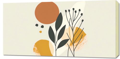 Obraz z serii boho zatytułowany Botaniczna Presja. Obraz prezentuje poetycką kompozycję botanicznych motywów i abstrakcyjnych form. Złapany w chwili spokoju bukiet delikatnych, ciemnozielonych gałązek z czarnymi owocostanami wznosi się dumnie na tle złocisto-pomarańczowych i beżowych kształtów, które mogą przypominać wschodzące słońce lub płatki kwiatów. Dyskretnie rozsiane mniejsze elementy, jak kropki w tonacji ziemi, nadają kompozycji lekkości i ruchu. Ta harmonijna gra kolorów i form wywołuje uczucie ciepła i natury, co czyni go idealnym dla przestrzeni, które mają na celu promowanie relaksu i odprężenia, jak salony, pokoje do jogi, czy też jadalnie, gdzie delikatne sztuki mogą inspirować spokojne rozmowy.