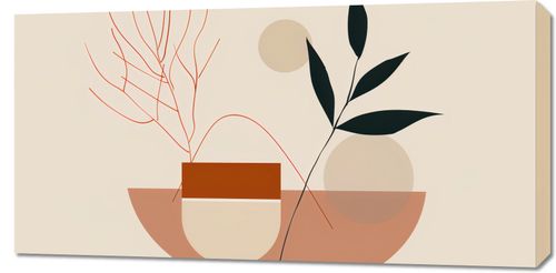 Obraz z serii boho zatytułowany Botaniczna Przymiarka.Obraz to harmonijna kompozycja abstrakcyjnych i naturalistycznych elementów. Wyraźne, organiczne linie roślin w ciepłej, rdzawej czerwieni i głębokiej czerni tworzą zaskakujący kontrast z miękkimi, geometrycznymi formami tła. Delikatne kolorystyczne przejścia i umieszczenie figur na różnych planach dodają głębi i złożoności całości. To dzieło będzie się pięknie prezentować w nowoczesnych, ale również w bardziej klasycznych wnętrzach, dodając im lekkości i współczesnego charakteru. Może stać się centralnym punktem w przestrzeniach takich jak minimalistyczne salony, biura, a także jako akcent w przestrzeniach medytacyjnych, zachęcając do spokoju i kontemplacji.