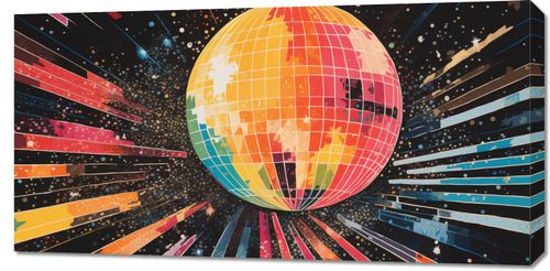 Obraz z serii pop art zatytułowany Disco Gra!. Obraz prezentuje stylizowaną dyskotekową kulę w kształcie globusu, która jest centralnym punktem kompozycji. Kulę otaczają wachlarze kolorowych promieni, które rozchodzą się na wszystkie strony, przypominając szybki ruch światła lub prędkość. Tło, przesycone ciemnymi odcieniami i przetykane jasnymi kropeczkami, może przywoływać na myśl kosmiczną przestrzeń lub nocne niebo. Barwne linie promieniujące od kuli dodają dynamiki i ruchu, a ich rozmieszczenie oraz kolorystyka nadają dziełu nowoczesny i energetyczny charakter. Obraz ten byłby idealnym akcentem w przestrzeniach rozrywkowych, takich jak kluby nocne, sale taneczne lub nawet jako żywy element dekoracyjny w domowym salonie, inspirowanym stylem retro lub miłością do muzyki.