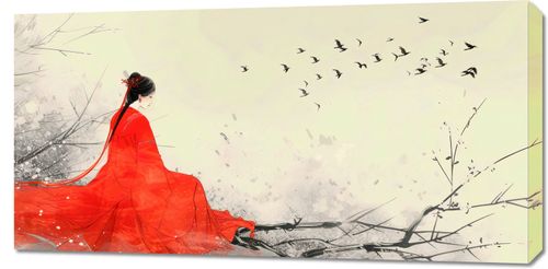 Obraz z serii motywy wschodnie zatytułowany Diva Na Gałęzi. Obraz przedstawia eteryczną scenę utrzymaną w delikatnej palecie barw z przewagą odcieni szarości i bieli, która kontrastuje z wyrazistą czerwienią. Na pierwszym planie widzimy postać kobiety w tradycyjnym, czerwonym stroju, z eleganckim uczesaniem i ozdobami we włosach, co sugeruje kulturalne lub historyczne znaczenie ubioru. Siedzi ona na gałęzi drzewa, a jej sukienka płynnie przechodzi w linie, które mogą symbolizować wiatr lub wodę, dodając grafice dynamiki. Tło jest stonowane i minimalistyczne, z subtelnymi plamami farby tworzącymi delikatną atmosferę. Nad sceną unosi się stado ptaków, które wzbija się do lotu, co może symbolizować wolność lub przejście. Całość kompozycji emanuje spokojem, melancholią i pięknem natury, a także może sugerować opowieść lub głębsze znaczenie skryte w postaci kobiety i jej połączeniu z otoczeniem.
