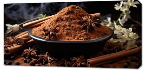 Obraz z serii święta zatytułowany Esencja Aromatu. Mocny akcent na kompozycję przypraw z cynamonem, anyżem i ziarnami pieprzu rozsypanych wokół miski pełnej mielonego cynamonu, tworzący wzór przypominający sztukę natury, wyróżnia się zarówno prostotą, jak i głębią. Delikatny dym unoszący się nad przyprawami dodaje atmosfery ciepła i domowego ogniska. Ten obraz idealnie komponuje się z kuchniami o bogatym, ziemskim wystroju, jak również z eleganckimi restauracjami oferującymi etniczną kuchnię, gdzie podkreśli uczucie przytulności i tradycji.