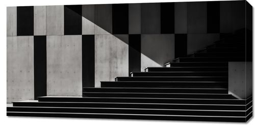 Obraz z serii pejzaże zatytułowany Geometria w Architekturze. Zjawiskowy kontrast światła i cienia na geometrycznych formach stwarza iluzję głębi i perspektywy, zachęcając widza do zadumy nad interakcją przestrzeni i światła. Czyste linie i wyraźne kontrasty doskonale komponują się z nowoczesnymi, minimalistycznymi oraz industrialnymi wnętrzami. Idealny dla przestrzeni biurowych, loftów oraz jako element dekoracyjny w galeriach sztuki współczesnej.