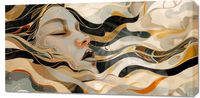 Obraz z serii abstrakcja zatytułowany Głębia. Prezentuje abstrakcyjne, stylizowane przedstawienie twarzy kobiety, zatopionej w płynnych, onirycznych formach przypominających fale lub wstęgi tkaniny. Szeroka gama barw, od głębokich czerni, przez delikatne beże, aż po złote i pomarańczowe akcenty, tworzy bogatą paletę kolorystyczną. Kontury twarzy są wyraźne i zmysłowe, z zamkniętymi oczami i lekko rozchylonymi ustami, co może sugerować stan zadumy lub ekstazy. Artystyczne linie tworzą złudzenie ruchu i płynności, a cała kompozycja jest zarówno dynamiczna, jak i harmonijna. Obraz ten może być interpretowany jako metafora piękna ludzkiego ducha, muzyki, sztuki lub emocji. Idealnie nadawałby się do eleganckich, nowoczesnych wnętrz, gdzie może stanowić główny punkt wizualny, przyciągając uwagę i inspirując do refleksji.