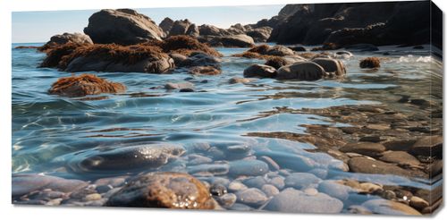 Obraz z serii pejzaże Harmonia Przybrzeżna przedstawia idylliczną scenę nadmorskiego krajobrazu, gdzie spokojne, krystalicznie czyste wody delikatnie odbijają skaliste wybrzeże. Skały pokryte morskimi wodorostami i okrągłe kamienie na pierwszym planie stanowią kontrast dla miękkiej tekstury wody. To artystyczne dzieło przypomina o naturalnej elegancji i spokoju, jakie można znaleźć w naturze. Obraz doskonale wpasuje się w przestrzenie pełne naturalnego światła i organicznych elementów, takie jak salon z widokiem na morze, gabinet relaksacyjny, czy przestrzeń wellness w luksusowym hotelu czy spa.