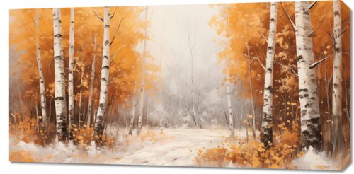 Obraz z serii pejzaże zatytułowany Jesienne Brzozy. Scena przedstawia ścieżkę snującą się przez las brzozowy, którego złoto-żółte liście są symbolem przemijania i naturalnego piękna jesieni. Delikatne pnie drzew z charakterystyczną białą korą wyłaniają się z mglistego tła, tworząc poczucie głębi i spokoju. Gra światła i cienia nadaje kompozycji miękkości, a spadające liście dodają dynamiki. Ten obraz jest idealny do przestrzeni pełnych ciepła i spokoju, takich jak salony, pokoje relaksacyjne, czy miejsca oczekiwania w gabinetach terapeutycznych, gdzie może wprowadzać atmosferę kontemplacji i uspokojenia.
