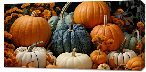 Obraz z serii natura zatytułowany Jesienne Urodzaje przedstawia bujne bogactwo jesieni. Centralne miejsce zajmuje soczysta, pomarańczowa dynia, królowa jesieni, otoczona przez różnorodność jej barwnych odmian. Niebieskawe i białe dynie tworzą wyjątkowy kontrast, a wszystko to uzupełnione jest przez złociste i burgundowe chryzantemy, które dodają kompozycji ciepła i głębi. Całość osadzona jest na tle w klasycznych, ciemnych odcieniach, co podkreśla elegancję i dojrzałość sezonu. Obraz ten idealnie wpasuje się w przestrzeń kuchni lub jadalni, dodając jej charakteru oraz ciepłego, domowego klimatu. Doskonale odnajdzie się także w przestrzeniach takich jak winiarnie czy restauracje serwujące sezonowe dania, gdzie podkreśli bogactwo i obfitość jesiennej palety smaków.