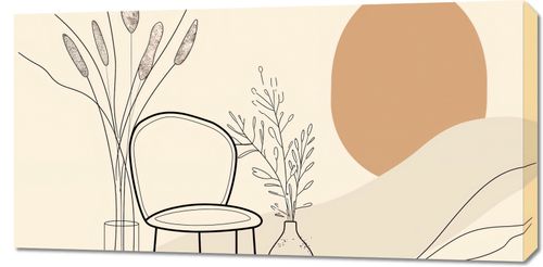 Obraz z serii boho zatytułowany Kącik Spokoju. Obraz prezentuje delikatny, linearny rysunek wnętrza, gdzie w centrum znajduje się eleganckie krzesło umieszczone obok stolika z wazonem i wysokimi, smukłymi roślinami. W tle, duża, okrągła forma w ciepłym, terra-cotta kolorze nadaje całości miękkiego, przytulnego charakteru. Linearna, subtelna paleta barw oraz gra cieni i światła tworzy atmosferę relaksu i wyciszenia. Ten obraz będzie doskonałym wyborem do dekoracji wnętrza, które ma być przestrzenią do odpoczynku i regeneracji. Jego prostota i elegancja sprawią, że doskonale odnajdzie się w salonach, pokojach do czytania, gabinetach czy medytacyjnych kącikach, wprowadzając spokojny i zbalansowany nastrój.