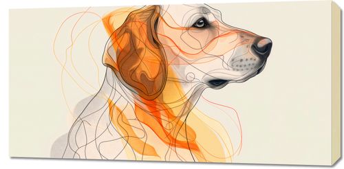 Obraz z serii abstrakcja zatytułowany Kontur Profilowego. Obraz przedstawia portret psa w stylu artystycznym, z subtelnie zaznaczonymi, ale wyraźnymi cechami. Kompozycja łączy realistyczne detale takie jak oczy, nos i uszy z abstrakcyjnymi, płynnymi liniami i plamami kolorów, które tworzą wrażenie ruchu i głębi. Dominujące kolory to odcienie pomarańczowego, żółtego i brązu, które idealnie oddają ciepło i przyjazny charakter zwierzęcia. Tło w neutralnym, pastelowym odcieniu podkreśla i równoważy bardziej dynamiczne elementy grafiki. Obraz emanuje spokojem i może wzbudzać pozytywne emocje, będąc jednocześnie wyrafinowanym, artystycznym przedstawieniem psa, który może być ulubieńcem rodziny lub po prostu przykuwającym uwagę elementem dekoracyjnym.