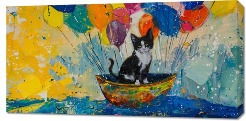 Obraz z serii abstrakcja zatytułowany Kot na Łodzi. Przedstawia on małego, czarno-białego kota siedzącego w malutkiej, kolorowej łódce, unoszącej się na żywych, błękitnych falach. Nad łódką unosi się bujny klaster jasnych, kolorowych balonów, które dodają obrazowi elementów wesołości i lekkości. Praca jest pełna energii, z widocznymi na całej powierzchni obrazu śladami energicznych pociągnięć pędzlem i plam farby, co nadaje dziełu nieco abstrakcyjny i ekspresyjny charakter. Ta mieszanka realistycznych i fantastycznych elementów tworzy ciepłą i zapadającą w pamięć scenę, która może wywoływać uśmiech i poczucie radości.