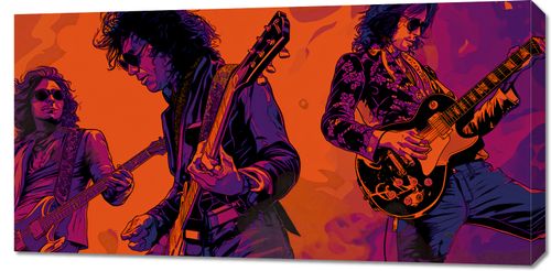 Obraz z serii pop art zatytułowany Mamy To Flow. Obrazuje trzech gitarzystów zanurzonych w pasji muzyki, z instrumentami w rękach, oddając ducha rock'n'rolla. Intensywne kolory, w tym głębokie odcienie pomarańczu i fioletu, tworzą tło, które pulsują energią i rytmem. Obraz oddaje esencję koncertowej atmosfery i jest hołdem dla klasycznych rockowych wirtuozów. Znakomicie wpasuje się w przestrzenie kulturalne, takie jak sale koncertowe, studia muzyczne, jak również jako żywiołowy akcent dekoracyjny w młodzieżowych pokojach czy salonach miłośników muzyki.