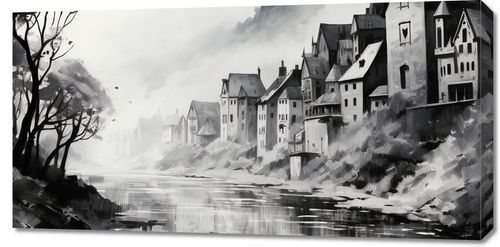 Obraz z serii pejzaże zatytułowany Mglisty Refleks. Misterne pociągnięcia pędzla przedstawiają starą wieś schowaną w mrocznych zakątkach gór, z dominującymi wieżami kościoła wznoszącymi się nad nią. Mgła otulająca krajobraz i odbicie w spokojnej wodzie tworzą atmosferę tajemniczości i zadumy. Monochromatyczna paleta barw dodaje głębi i intensywności całemu obrazowi, czyniąc go idealnym wyborem dla klasycznych salonów oraz miejsc takich jak kawiarnie o historycznym charakterze czy ekskluzywne kluby dyskusyjne.