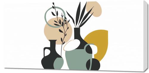 Plakat z serii minimalistyczne zatytułowany Modernistyczna Kompozycja. Grafika ta przedstawia stylizowane wazony w tonacjach czerni i zgaszonego zielonego, wypełnione abstrakcyjnymi roślinami. Tło tworzy gra geometrycznych kształtów i pastelowych barw, takich jak beż i musztardowy, co nadaje całości współczesnego, a zarazem ponadczasowego wygląduIdealnie pasowałby do wnętrz utrzymanych w duchu współczesnego minimalizmu, takich jak nowoczesne salony, minimalistyczne biura, czy loftowe przestrzenie. Świetnie sprawdziłby się również jako akcent w przestrzeniach, gdzie dominuje surowy beton lub eksponowane są naturalne elementy, takie jak drewniane belki czy ceglane ściany. Dzięki swojej prostocie i elegancji, plakat może stać się subtelnym, ale wyraźnym elementem dekoracyjnym.