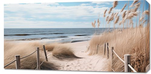 Obraz z serii pejzaże zatytułowany Nadmorski Most to tytuł tej zapierającej dech w piersiach ilustracji, która przemawia do duszy miłośnika morza. Delikatne trawy morskie tańczą w rytmie przybrzeżnego wiatru, a spokojne fale delikatnie docierają do złocistego piasku, tworząc melodię naturalnego spokoju. Nieskazitelnie błękitne niebo przechodzące w pastelowe odcienie na horyzoncie dodaje głębi i przestrzeni, tworząc obraz idealny do umieszczenia w przestrzeniach, które celebrują ciszę i kontemplację. Ten obraz będzie wyjątkowym dodatkiem do każdej plażowej chaty, salonu nadmorskiego domu, a nawet biura, przypominając o nieskończonej przestrzeni i wolności, jaką oferuje morze.