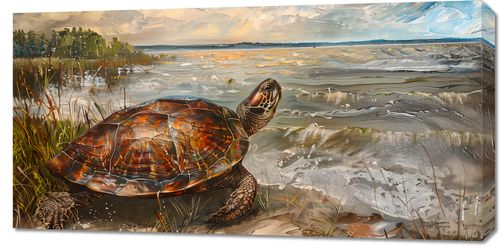 Plakat z serii abstrakcja zatytułowany Nadmorski Żółw. Przedstawia realistycznie namalowanego żółwia na tle malowniczego krajobrazu nadmorskiego. Żółw o imponującej, bogato zdobionej skorupie o ciepłych, miedzianych i brązowych odcieniach, stoi na złocistym piasku u brzegu wody. Wokół niego delikatne trawy i roślinność nadmorska, które wraz z żółwiem są oświetlone jasnym, ciepłym światłem, sugerującym zachód słońca. Tło obrazu to dynamicznie przedstawione, szarawe fale morskie, które łagodnie uderzają o brzeg, oraz zachmurzone niebo z prześwitami niebieskiego i złotymi refleksami słońca. Scena wywołuje poczucie spokoju i harmonii z naturą, podkreślając piękno i siłę powolnego, ale pewnego postępu, symbolizowanego przez żółwia. Świetnie sprawdzi się we wnętrzach o tematyce morskiej, jak i również restauracjach.