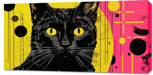 Obraz z serii pop art zatytułowany Neonowy Kocur - odważne połączenie klasycznego portretu kota z awangardowymi elementami graficznymi. Czarny kontur kota na intensywnym żółtym i różowym tle przyciąga wzrok i wzbudza zainteresowanie. Żółte oczy kota są jak punkty skupienia, które przykuwają uwagę i dodają charakteru dziełu. Abstrakcyjne formy i plamy koloru w tle wprowadzają dynamiczność i nowoczesny charakter, idealnie pasując do współczesnych przestrzeni mieszkalnych i komercyjnych. Ten obraz będzie doskonałym wyborem dla miłośników sztuki, którzy pragną dodać odrobinę kreatywności i koloru do swojego wnętrza.