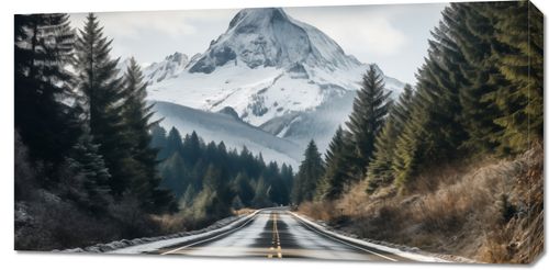 Obraz z serii pejzaże zatytułowany Odważna Podróż, przedstawia majestatyczną górę wyłaniającą się z pośród ciemnozielonych drzew iglastych, które wyznaczają drogę prowadzącą w kierunku jej śnieżnego szczytu. Siła i niezachwiana postawa góry w połączeniu z miękkimi konturami puchowych chmur nad nią tworzą doskonałą równowagę między wytrwałością a delikatnością. Czarna, wilgotna nawierzchnia drogi, rozświetlona światłem odbijającym się od jej wilgotnej powierzchni, prowadzi wzrok obserwatora wprost do serca dzikiej przyrody. Kontrast między ciemnymi drzewami a bielą śniegu dodaje dziełu głębi i tajemniczości. Ten obraz będzie idealnym dodatkiem do wnętrz o tematyce przygodowej i eksploracyjnej, jak również doskonałym wyborem dla przestrzeni biurowych firm turystycznych lub agencji podróżniczych, gdzie może inspirować i przypominać o majestacie i pięknie niezbadanych zakątków świata.