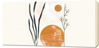 Obraz z serii wnętrza zatytułowany Przebłysk. Obraz prezentuje abstrakcyjną kompozycję o spokojnej, naturalnej kolorystyce, z dominującymi odcieniami beżu, pomarańczu i czerni. Centralne miejsce zajmują dwa okręgi, które mogą symbolizować słońce i księżyc lub inne astronomiczne ciała, z subtelnymi detalami przypominającymi krążki planetarne lub satelity. Obok nich znajdują się stylizowane rośliny lub trawy, które swoją smukłą formą i ciemnym kolorem tworzą kontrast wobec jaśniejszego tła. Dodatkowy element graficzny w postaci gałęzi z prostymi liniami przypomina drzewo lub krzew, dodając kompozycji organicznego charakteru. Całość jest utrzymana w stylistyce minimalizmu, z delikatnymi teksturami i rozpryskami, które nadają dziełu lekkości i nowoczesnego wyglądu. Ograniczona paleta barw oraz proste formy sugerują spokój i harmonię, co czyni obraz odpowiednim dla przestrzeni, które mają za zadanie inspirować do wyciszenia i refleksji.