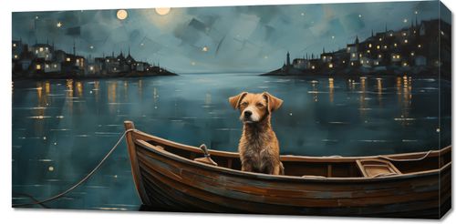 Obraz z serii wnętrza o nazwie Przygoda o Północy, ukazuje wzruszający obraz psa o przenikliwym spojrzeniu, siedzącego samotnie w łodzi na tle tajemniczego miasta. Oświetlone latarniami uliczki nadbrzeżnego miasteczka tworzą tło, które mieni się złotem i błękitem w spokojnych wodach portu, nadając scenie element magii i spokoju. Pies, o czujnym wzroku i szlachetnej postawie, jest przedstawiony z niezwykłą dbałością o detale, co sprawia, że wydaje się być bohaterem nieznanego, ale pociągającego opowiadania. Jego obecność w łodzi dodaje kompozycji głębi emocjonalnej, sugerując wierność i oczekiwanie. Plakat ten wprowadzi do każdego wnętrza element spokoju i refleksji, idealnie pasując do przestrzeni wypełnionych ciepłem i nostalgicznym urokiem, takich jak przytulne salony, kawiarnie, czy miejsca odpoczynku.