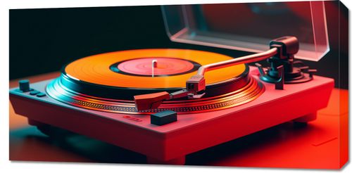 Obraz z serii pop art zatytułowany Retro Granie. Ta ilustracja ukazuje klasyczny gramofon w intensywnych kolorach, z winylową płytą obracającą się na talerzu. Ciepłe odcienie czerwieni i pomarańczy gramofonu kontrastują z chłodnymi, neonowymi akcentami w tle, tworząc nowoczesny, a jednocześnie nostalgicznym klimat. Obraz oddaje hołd złotej erze muzyki winylowej i jest idealnym elementem dekoracyjnym dla miłośników muzyki, dodającym charakteru każdemu wnętrzu, od salonów po muzyczne kąciki czy studia nagrań.