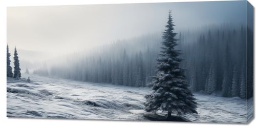 Obraz z serii pejzaże zatytułowany Samotna Choinka. Ta grafika ukazuje malowniczy, zimowy krajobraz z dominującą pojedynczą, okazałą choinką pokrytą śniegiem. Otoczona przez delikatnie zasnutej mgłą lasy, podkreśla spokój i majestatyczną ciszę zimy. Delikatne odcienie błękitu i bieli tworzą wrażenie chłodu i spokoju. Ten obraz będzie idealnym dodatkiem do każdego wnętrza, gdzie chcemy wprowadzić atmosferę spokoju i kontemplacji, świetnie sprawdzi się w przestrzeniach takich jak gabinety relaksacyjne, spa, a także jako element dekoracyjny w domowych salonach lub sypialniach.