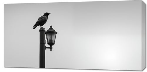 Obraz z serii wnętrza zatytułowany Samotny Postój Kruka. Prezentuje on sylwetkę kruka spoczywającego na klasycznej latarni ulicznej, uchwyconą w monochromatycznej palecie szarości. Ten spokojny, lecz sugestywny obraz jest symbolem refleksji i tajemnicy, doskonale wpisując się w klimat współczesnych przestrzeni miejskich. Praca ta z pewnością stanie się wyrazistym dodatkiem do nowoczesnych wnętrz, takich jak lofty czy minimalistyczne salony, a także wniesie element zastanowienia do przestrzeni publicznych takich jak galerie, kawiarnie i biblioteki, gdzie odosobnienie miesza się z miejskim zgiełkiem.
