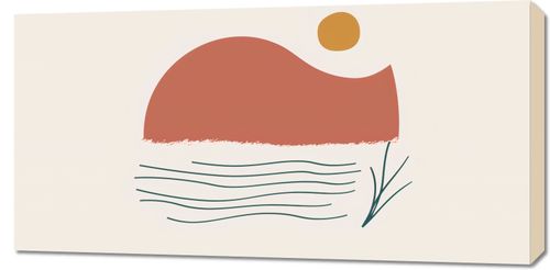 Obraz z serii boho zatytułowany Serenada Zachodzącego Słońca.Ten obraz oddaje spokojny krajobraz zachodu słońca w stylu minimalistycznym. Duży, łagodny wzgórze w ciepłym czerwonym kolorze dominuje kompozycję, a powyżej, w spokojnym niebie, słońce świeci w odcieniach złota. Proste linie poniżej wzgórza mogą symbolizować spokojne fale wody, a zielone elementy przywodzą na myśl ciche szumienie traw. Dzieło to doskonale nadaje się do każdego wnętrza, w którym chcemy wprowadzić elementy spokoju i natury, zachowując jednocześnie prostotę i czystość form. Świetnie sprawdzi się w przestrzeniach takich jak salon, sypialnia, czy miejsce przeznaczone do medytacji i wyciszenia.