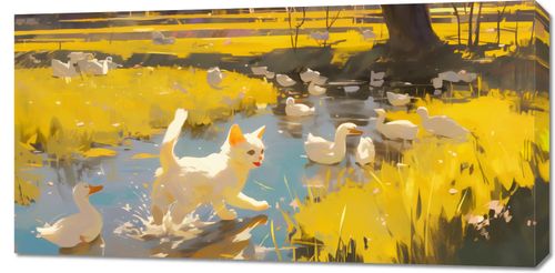 Obraz z serii abstrakcja zatytułowany Słońce na Wsi. Przedstawia idylliczną, słoneczną scenę na wsi, gdzie głównymi bohaterami są bawiący się kotek i grupa kaczek w tle. Kot, o białym umaszczeniu z jasnymi plamami, jest uchwycony w ruchu, co nadaje scenie dynamiki. Kaczki spokojnie pływają po lustrzanej tafli wody, otoczonej przez żywo żółtą trawę, co tworzy kontrast z białym kotem. Światło słoneczne rozświetla scenę, nadając jej ciepły, przyjemny nastrój. Obraz ma wyraźnie impresjonistyczny charakter, z luźnymi pociągnięciami pędzla i żywymi plamami kolorów, co czyni go atrakcyjnym dla tych, którzy cenią sobie wiejski spokój i piękno natury. Idealnie pasowałby do wnętrz, które mają na celu stworzenie atmosfery relaksu i spokoju, jak pokoje dzienne, przestrzenie odpoczynkowe, a nawet pokoje dla dzieci.