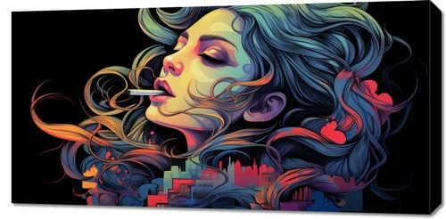 Obraz z serii pop art zatytułowany Sny o Samej Sobie. Ta intensywnie kolorowa ilustracja przedstawia profil młodej kobiety z zamkniętymi oczami, wdychającej życie miasta. Jej włosy i wydychany dym przenikają się, tworząc hipnotyzujące wzory, które płynnie przechodzą w sylwetki miejskiej panoramy. Paleta barw łączy głębokie granaty, żywe pomarańcze i delikatne pastele, co nadaje dziełu zarówno dynamikę, jak i eteryczną jakość. Obraz idealnie oddaje związek między osobistymi doświadczeniami a pulsującym życiem metropolii, co sprawia, że będzie on wyjątkowym dodatkiem do nowoczesnych, miejskich wnętrz, studiów artystycznych, czy loftów.