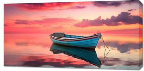 Obraz z serii pejzaże zatytułowany Spokój przed Połowem. Ta malownicza scena przedstawia samotną łódź na tafli wody, z tłem zachodzącego słońca, które barwi niebo i powierzchnię wody w odcienie czerwieni i pomarańczy. Odbicie łodzi w wodzie tworzy symetrię, która wprowadza w stan medytacji i spokoju. Obraz doskonale nadaje się do pomieszczeń, gdzie chcemy wprowadzić elementy natury i harmonii, takich jak salony, gabinety czy przestrzenie wellness.