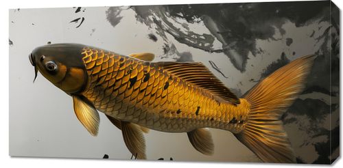 Obraz z serii motywy wschodnie zatytułowany Spokojna Ryba Koi. Prezentuje majestatycznego karpia koi o złocistych łuskach, który zdaje się płynąć pośród atramentowych pociągnięć pędzla na tle inspirowanym tradycyjną japońską kaligrafią i tuszem sumi-e. Elegancja i spokój ryby w połączeniu z dynamicznym, ale minimalistycznym tłem odzwierciedlają harmonię i piękno wschodniej estetyki. Ta sztuka, która łączy w sobie siłę i delikatność, sprawdzi się doskonale w przestrzeniach, gdzie ceniona jest równowaga i medytacyjna atmosfera, takich jak salony spa, gabinety masażu, joga lub pilates studio, a także jako uspokajający element dekoracyjny w nowoczesnych domach lub biurach.
