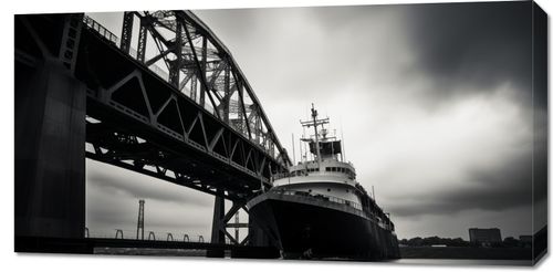 Obraz z serii pejzaże zatytułowany Statek przy Moście. Monochromatyczne przedstawienie statku pod imponującym mostem, gdzie struktury inżynieryjne łączą się z dynamicznym niebem, tworząc kompozycję symbolizującą siłę i postęp. Chłodna paleta barw i silne linie prowadzące oko przez obraz idealnie nadają się do nowoczesnych przestrzeni biurowych lub urbanistycznych salonów. Obraz ten przyciąga uwagę i inspiruje, odzwierciedlając majestat i piękno konstrukcji stworzonych przez człowieka.