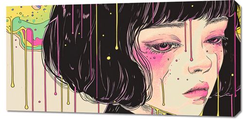 Obraz z serii pop art zatytułowany Strugi Kolorów. Ten hipnotyzujący obraz przedstawia wizerunek młodej kobiety z przymkniętymi oczami, jej twarz zdaje się być na granicy snu i jawy. Nad nią i wokół niej płyną strugi kolorów, które wydają się rozlewać jak ciecz, tworząc atmosferę oniryczną i abstrakcyjną. Kontrast między realistyczną twarzą a surrealistycznym tłem podkreśla emocjonalną głębię i złożoność ludzkich doświadczeń.Obraz ten doskonale uzupełni przestrzeń pełną kreatywności i wyobraźni, taką jak pracownie artystyczne, kawiarnie, czy nawet nowoczesne pokoje młodzieżowe. Może również stanowić niebanalny akcent w pomieszczeniach terapeutycznych lub coachingowych, gdzie rozmowa na temat emocji i wewnętrznego świata jest na porządku dziennym.