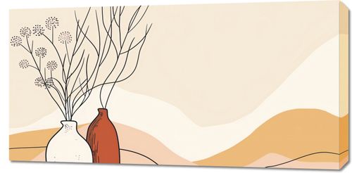 Obraz z serii minimalistyczne zatytułowany Stylowe Beże. Obraz przedstawia uproszczoną, elegancką kompozycję waz z suszonymi roślinami na tle delikatnych, pustynnych wzgórz. Wazony o prostych formach i kontrastowych kolorach - jeden biały, drugi w odcieniu ciepłej cegły - stoją przed zmiennym tłem beżów i brązów. Rośliny zostały przedstawione za pomocą czarnych, finezyjnych linii, które dają iluzję delikatności i subtelności. Obraz z łatwością wpasuje się w różne wnętrza dzięki swojej neutralnej palecie kolorów i prostocie form. Będzie doskonałym wyborem do pomieszczeń urządzonych w stylu skandynawskim, boho, a także w nowoczesnych przestrzeniach biurowych. Zapewnia ciepło i wyrafinowanie, a jednocześnie nie przytłacza przestrzeni.