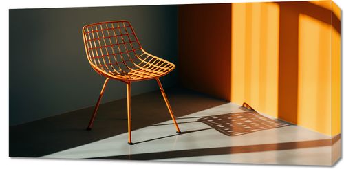 Obraz z serii wnętrza zatytułowany Świetlista Gra. Prezentuje on minimalistyczne podejście do designu, gdzie każda linia i kształt ma swoje znaczenie. Jasne odcienie pomarańczu rzucające się na prostą, ale stylową metalową krzesło tworzą dynamiczny efekt cienia i światła, który jest jednocześnie subtelnym, ale i wyrazistym elementem dekoracyjnym. Idealny dla nowoczesnych przestrzeni biurowych lub mieszkalnych, wprowadzając do nich artystyczną atmosferę z nutą awangardy. To dzieło sztuki doskonale komponuje się z surową elegancją współczesnych, urbanistycznych wnętrz.