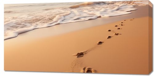 Obraz z serii pejzaże zatytułowany Szepty Fal przedstawia obraz, który zaprasza widza do kontemplacji i refleksji. Delikatne ślady stóp wskazują na cichą obecność, a przytłumione szumy fal i miękki piasek podkreślają uczucie spokoju. Rozmyte kolory zachodu słońca, które malują niebo na niemal nierzeczywiste odcienie pomarańczy i błękitu, wydają się być synonimem spokojnego zakończenia dnia. Ta praca idealnie wkomponuje się w estetykę współczesnych salonów lub pokoi wypoczynkowych, które cenią sobie minimalizm i naturę, a także będzie znakomitym wyborem dla przestrzeni wellness i spa, gdzie harmonia i spokój są kluczowymi elementami.
