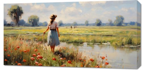 Obraz z serii pejzaże zatytułowany Wiejski Spokój. Przedstawia on kobietę w kapeluszu, stojącą na polu pełnym czerwonych maków, z zadumą spoglądającą w dal na rozległe, sielskie pejzaże. Jej postać, uchwycona od tyłu, emanuje spokojem i zamyśleniem, podkreślając intymny związek z naturą. Styl malarski obrazu, przypominający impresjonizm, z jego delikatnymi pociągnięciami i jasnymi barwami, sprawia, że scena jest zarówno realistyczna, jak i poetycka. Niebo jest przestronne i pełne lekkich chmur, co dodaje lekkości i przestronności. Ten obraz idealnie nadawałby się do dekoracji wnętrz, gdzie chcemy wprowadzić atmosferę spokoju i kontemplacji, takich jak salony, pokoje gościnne, gabinety terapeutyczne, a także przestrzenie użyteczności publicznej, które pragną stworzyć oazę wytchnienia dla swoich odwiedzających.